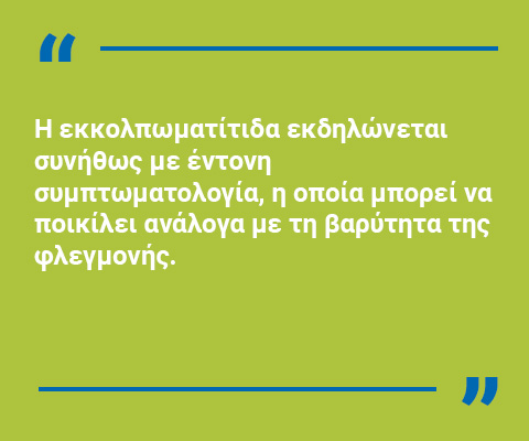 Η εκκολπωματίτιδα εκδηλώνεται συνήθως με έντονη συμπτωματολογία, η οποία μπορεί να ποικίλει ανάλογα με τη βαρύτητα της φλεγμονής.