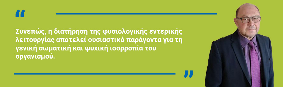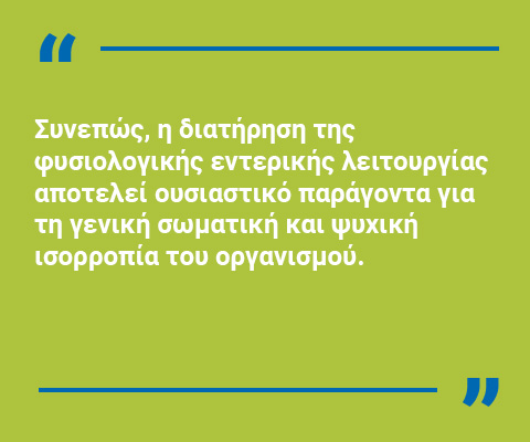Συνεπώς, η διατήρηση της φυσιολογικής εντερικής λειτουργίας αποτελεί ουσιαστικό παράγοντα για τη γενική σωματική και ψυχική ισορροπία του οργανισμού.