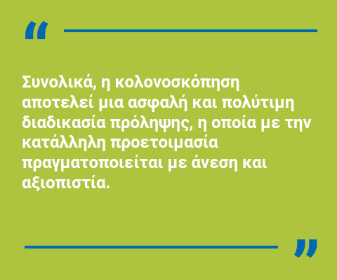 Συνολικά, η κολονοσκόπηση αποτελεί μια ασφαλή και πολύτιμη διαδικασία πρόληψης, η οποία με την κατάλληλη προετοιμασία πραγματοποιείται με άνεση και αξιοπιστία.